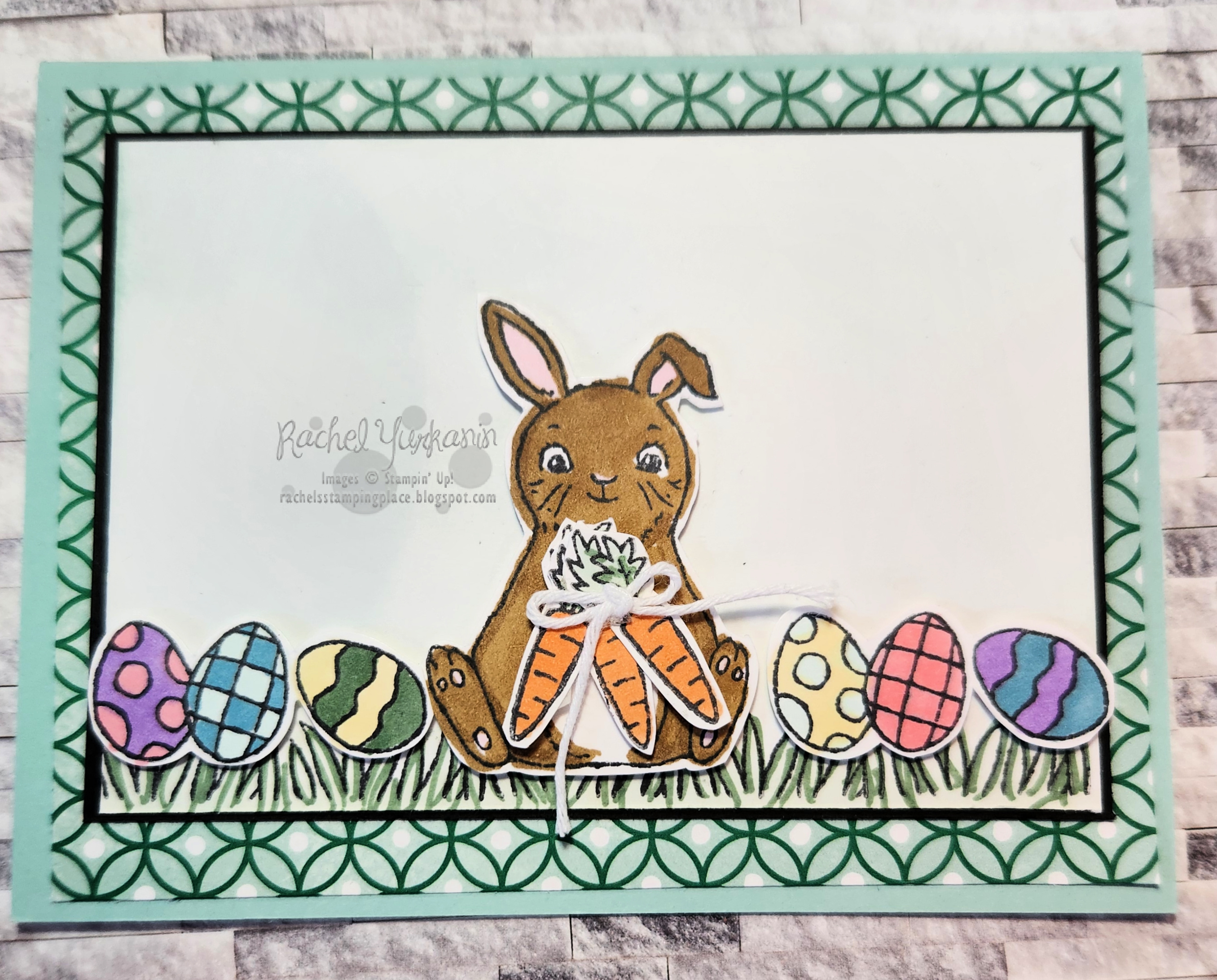 Then we have a colorful egg and bunny card made by Rachel Yurkanin. This is a fun card any child would be surprised to receive in the mail. Visit her blog for more details.